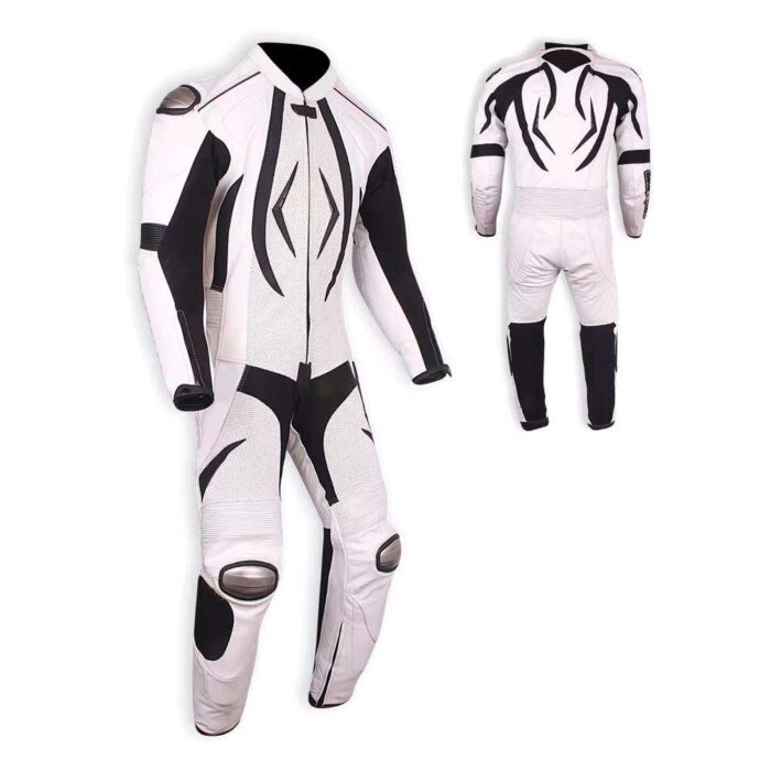 Home Men's Motorbike leather suits Black & White Men’s Leather Motorcycle Racing Suits – Full Body Biker Gear with Track & Street Riding Outfit