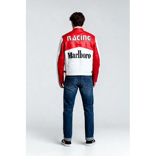 This unisex Marlboro racing leather jacket is a retro-inspired piece that captures the essence of classic motorsport fashion. Crafted from premium cowhide leather, it offers durability, strength, and a high-quality finish designed for long-term wear.The jacket features a color-block design, creating a distinctive and bold racing aesthetic. In addition, the cafe racer silhouette with an erect collar delivers a clean, streamlined look that remains timeless.Moreover, the jacket is detailed with digital printed racing-style logos, including Marlboro, Michelin, Arai, and Alpine-stars, giving it an authentic motorsport identity. The zippered cuffs enhance adjustability and ensure a better fit during wear.Designed with a unisex fit, this jacket offers versatility for both men and women. Whether worn for motorcycle riding or styled as a streetwear statement piece, it blends vintage racing inspiration with modern fashion appeal.